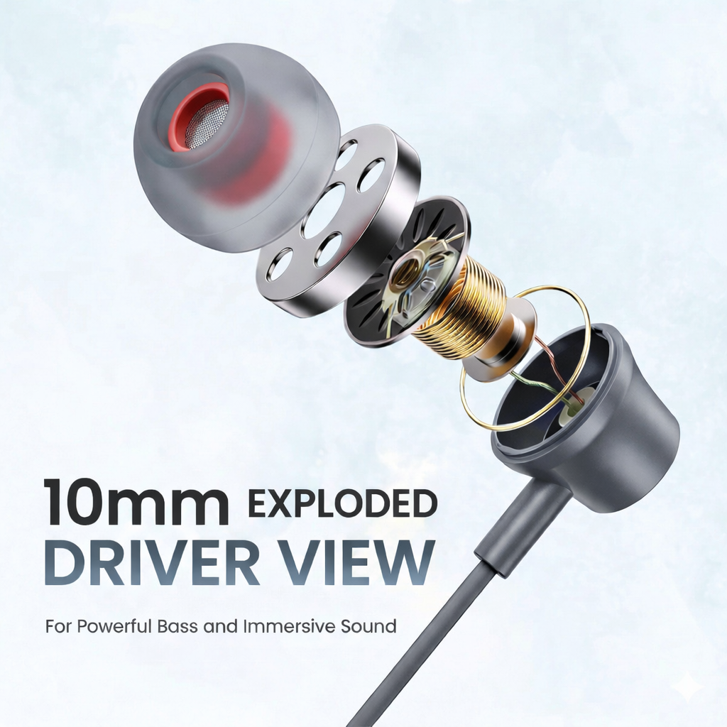 - 10mm Dynamic Drivers: Tuned specifically for heavy bass and crisp stereo sound reproduction.